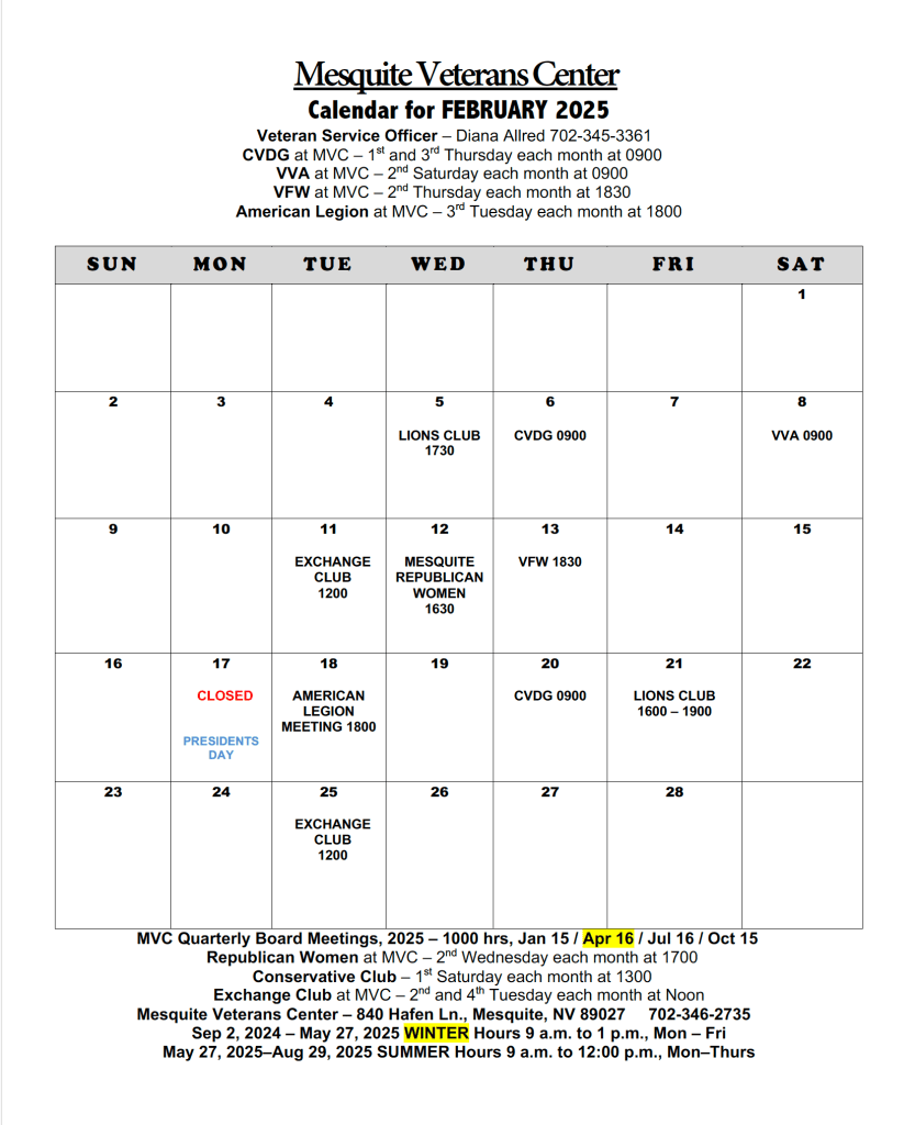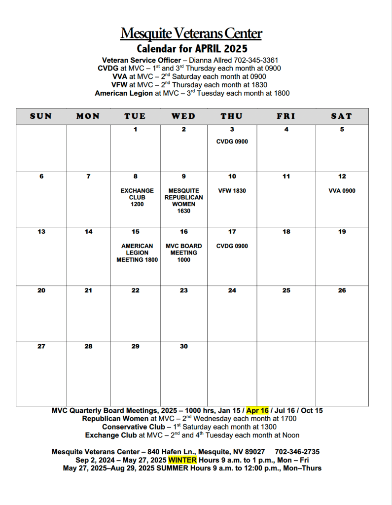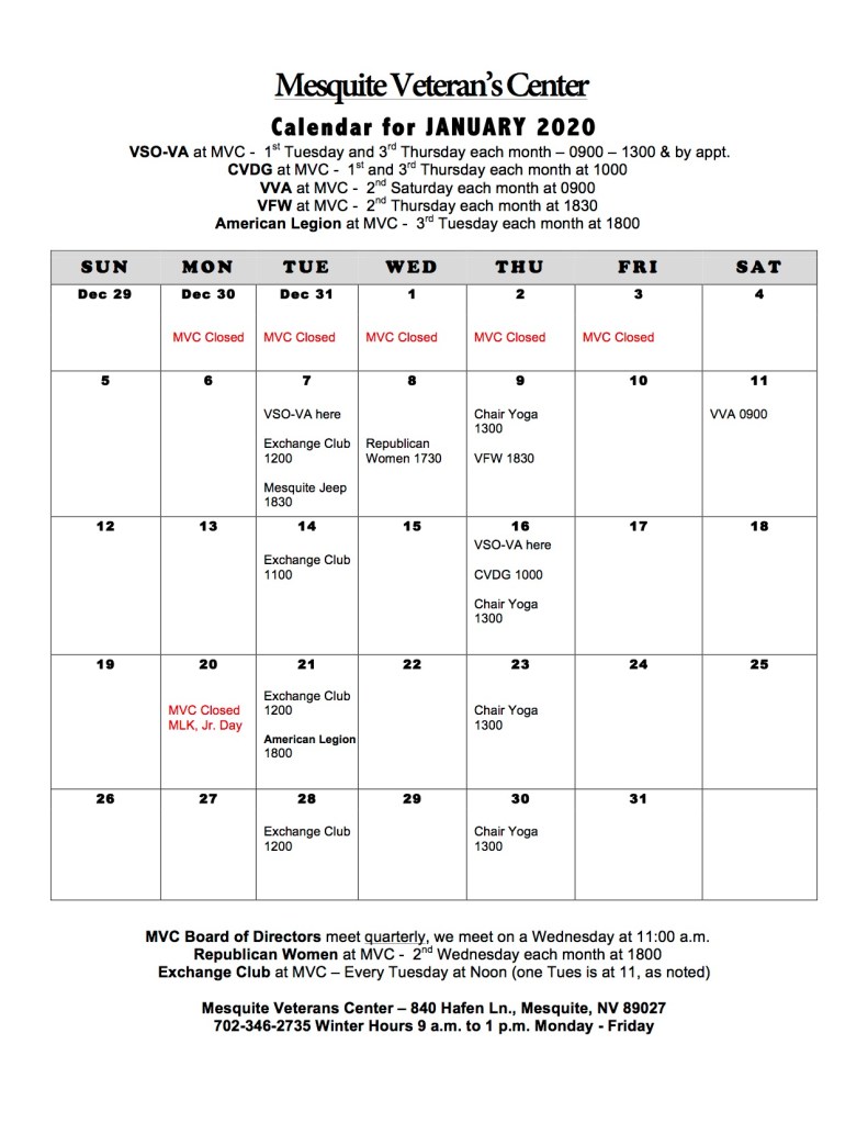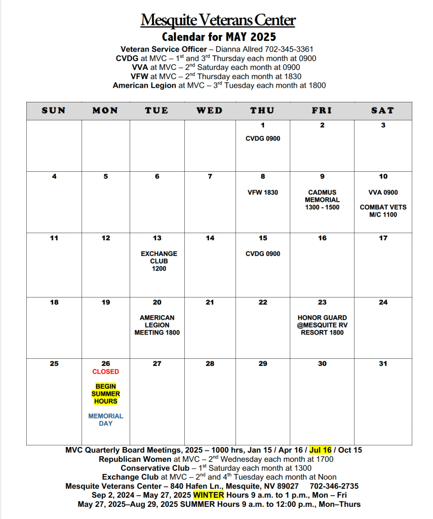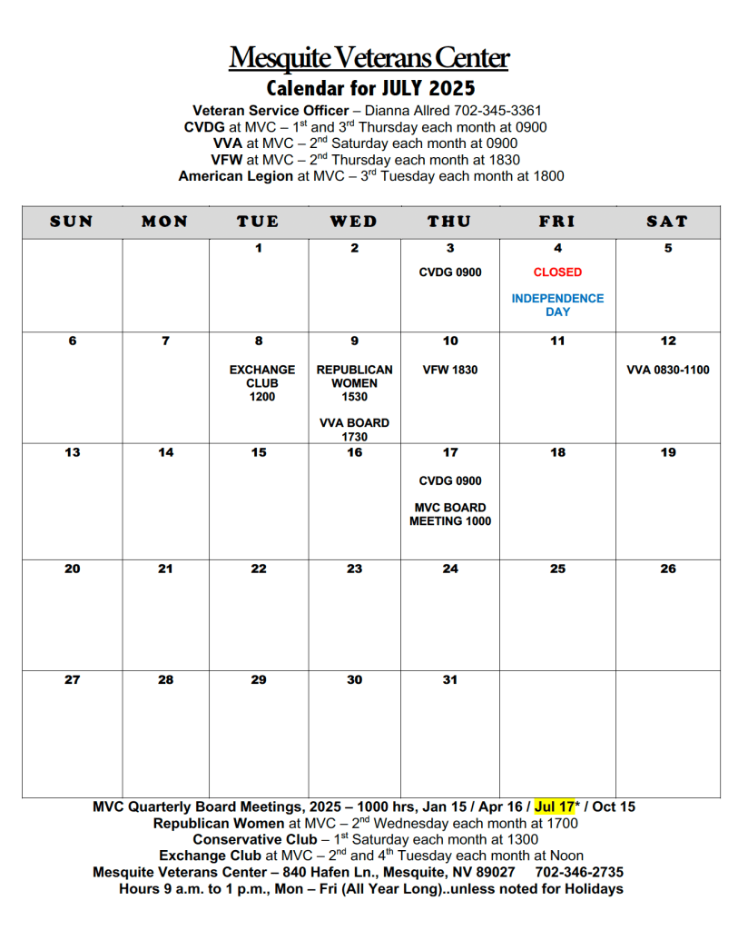 April and May had no calendar due to closures brought about by Covid-19. We happily opened again in June to continue serving our local Veterans.
