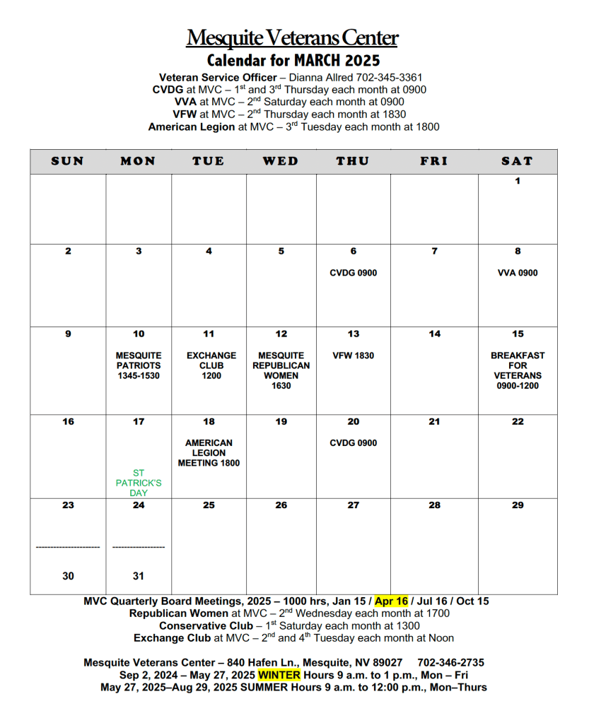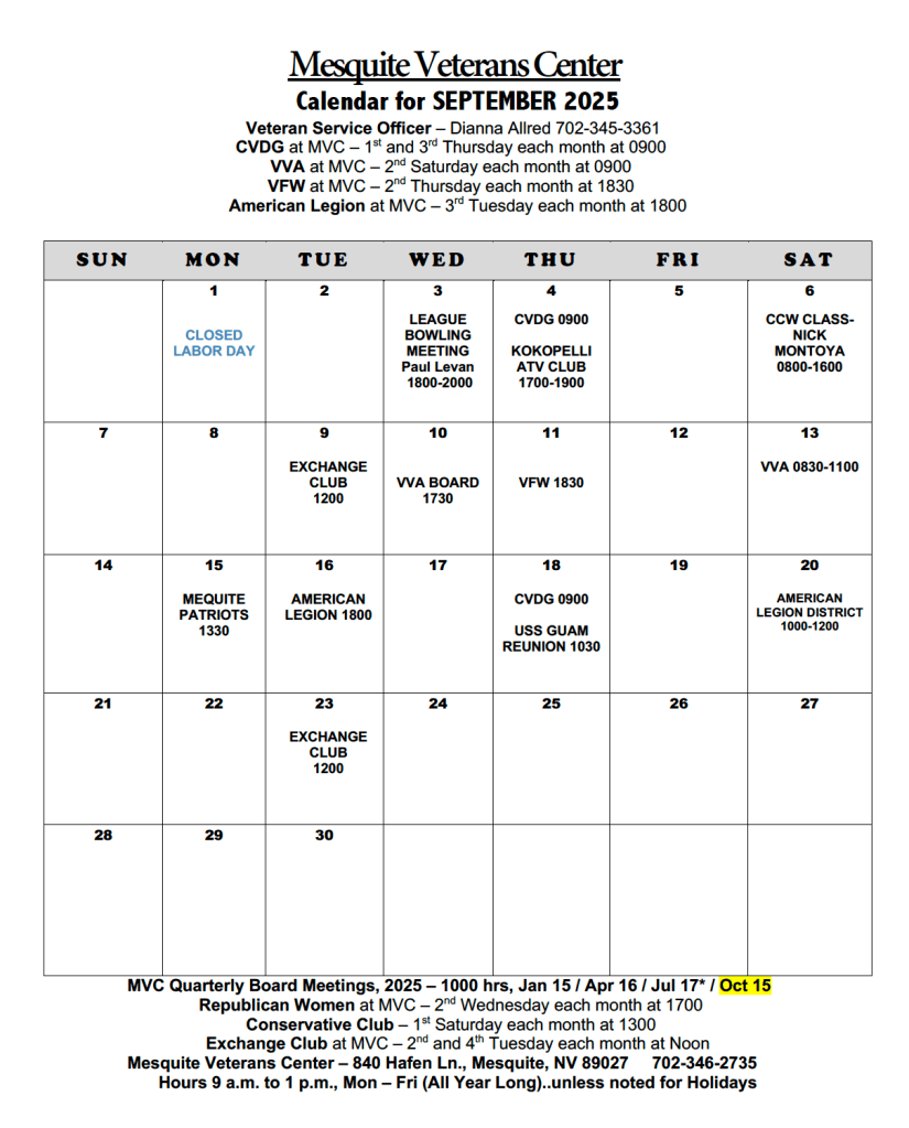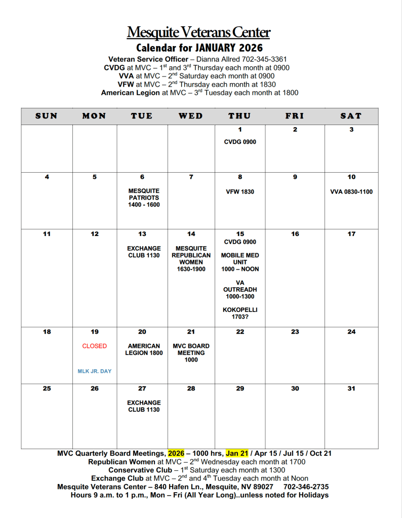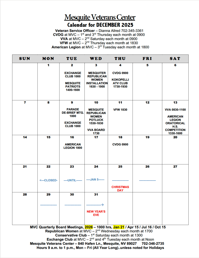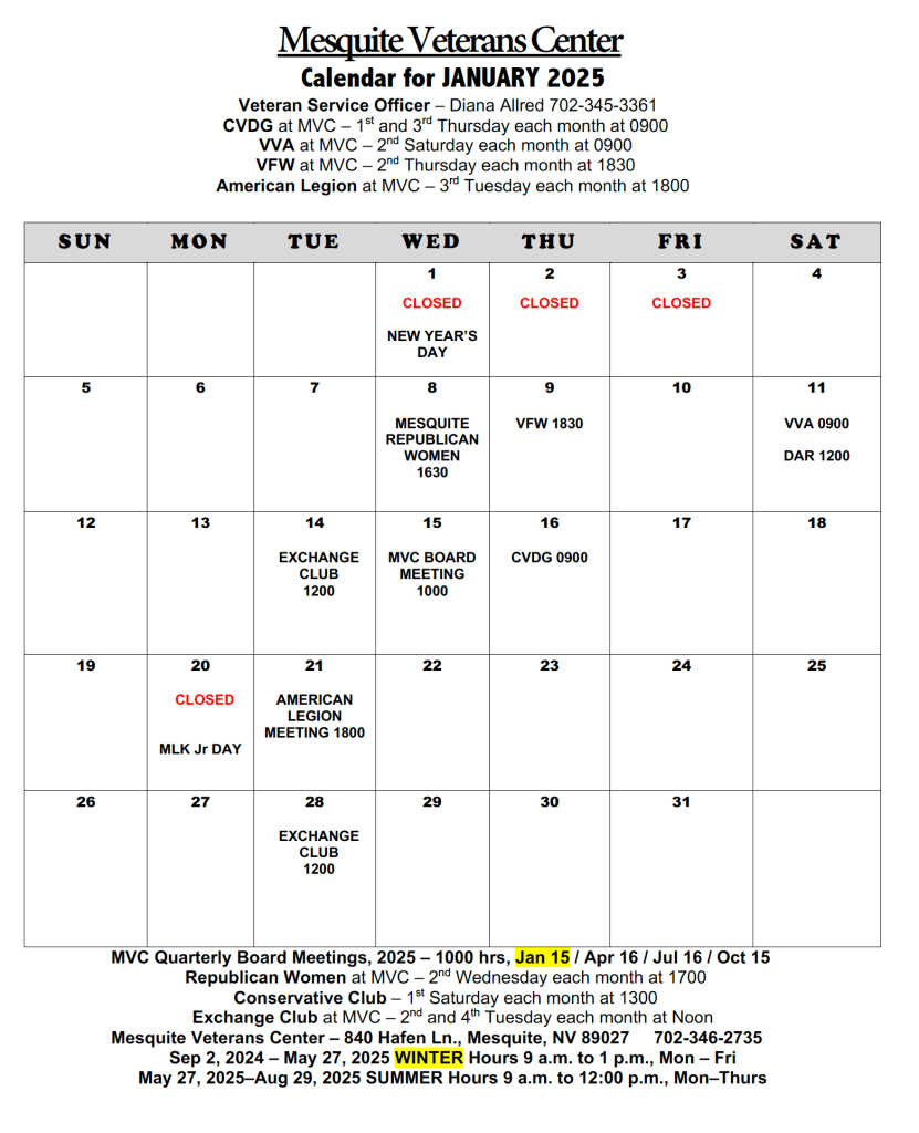 April and May had no calendar due to closures brought about by Covid-19. We happily opened again in June to continue serving our local Veterans.
