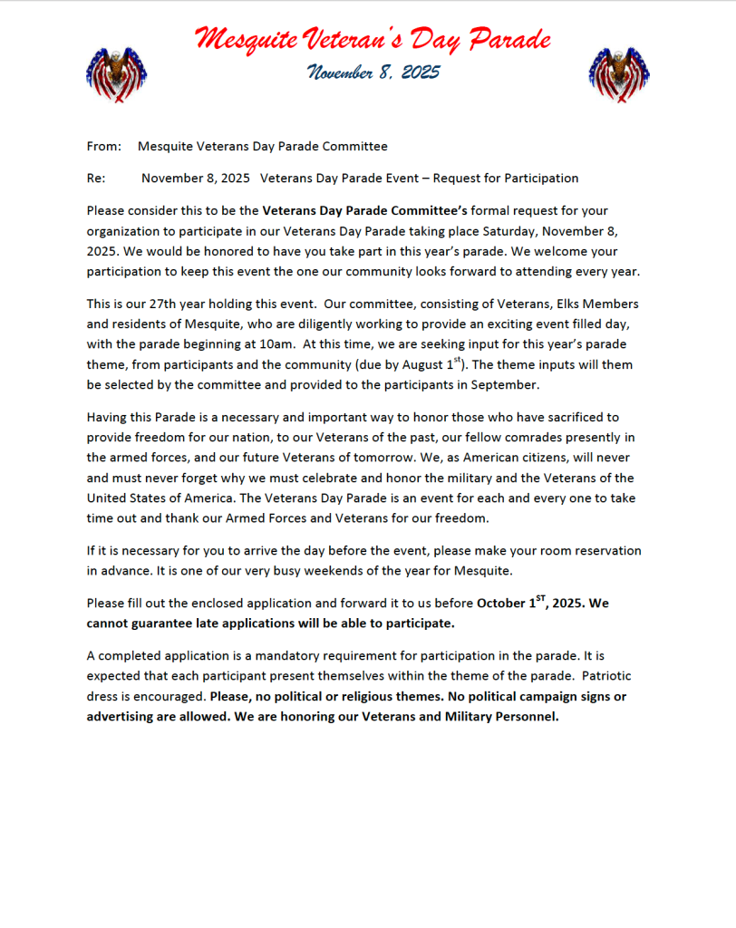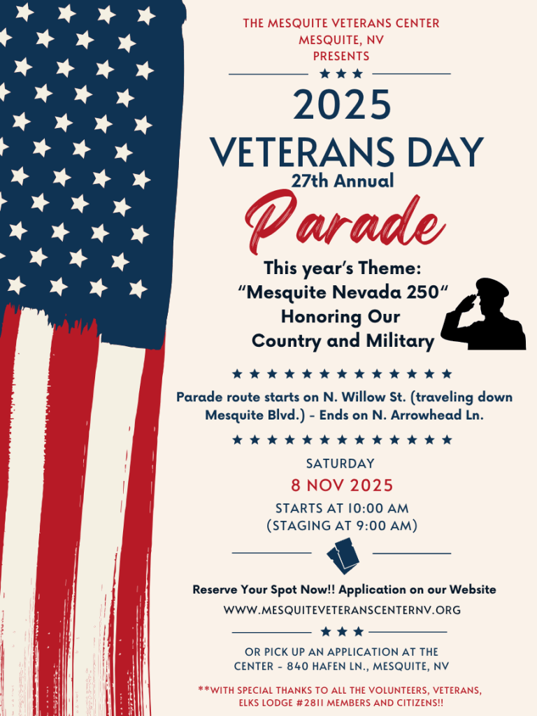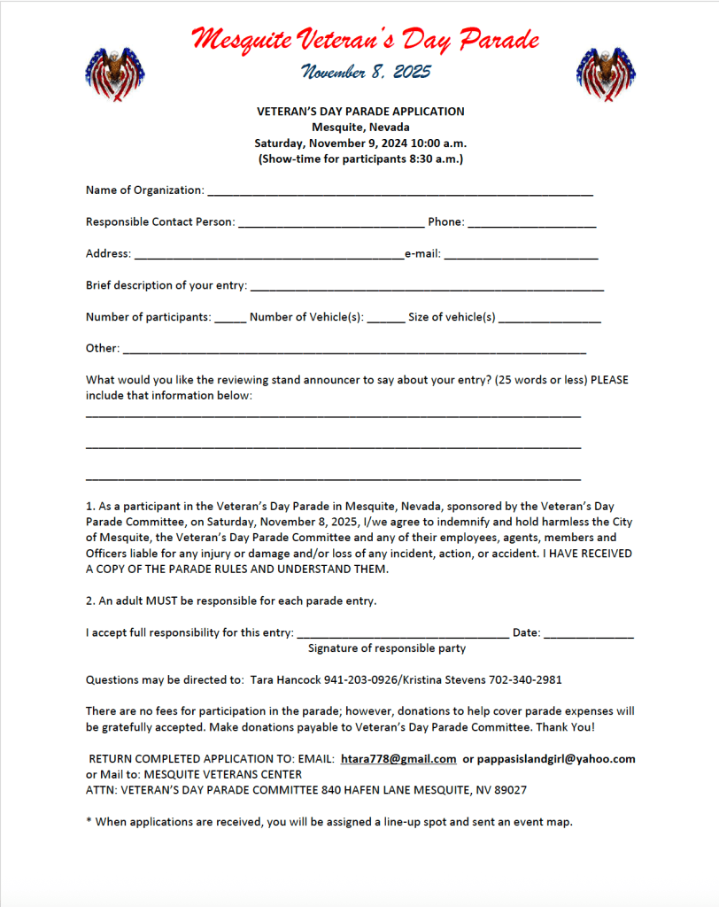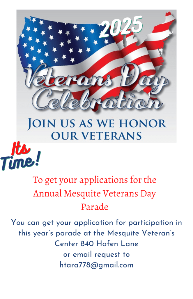 Here’s the Flyer and Application for participation in the Veterans Day 2025 Parade! Feel free to print and share!!
